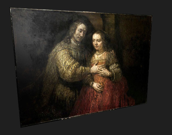 こうしたRaking light photography(測光線写真) を眺めると「私たちは3次元情報を感じる」…ということは、コンピュータにだって測光線写真から絵画の3次元情報を復元できるはず…ということで、2014年の終わり近くの今日…WebGLベースのレンブラントの「ユダヤの花嫁(イサクとリベカ)3次元風…を作ってみました。