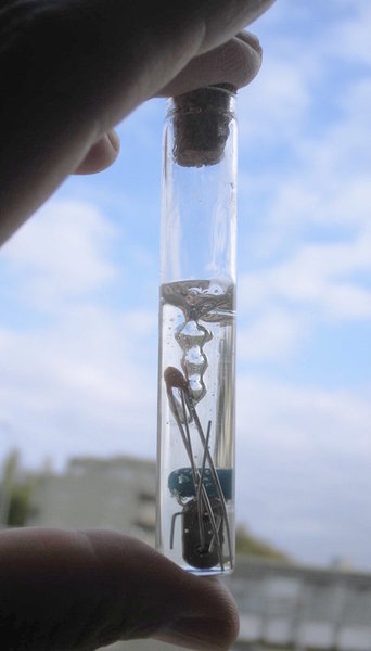 「ミニチュア試験管の中で電子部品が溶けている水溶液を育てたら一体どうなるだろう?」…とふと考えて、今日はこんなキーホルダーを作ってみました。