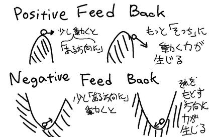 ポジティブ・フィードバックと反対に、「ある方向に動いたとき、それと逆方向に力が働くこと」をネガティブ・フィードバックと呼ぶ。下に描いたように、谷底のボール(あるいは登山者)にはネガティブ・フィードバックが働くわけである。