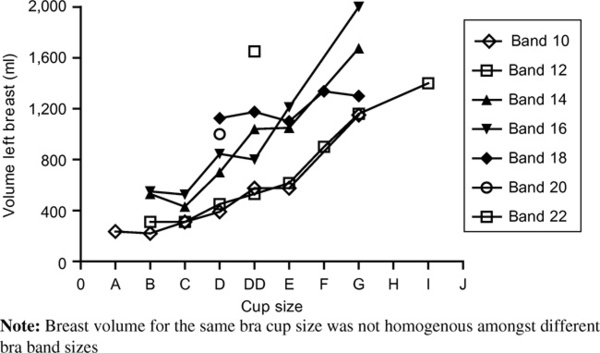 International Journal of Clothing Science and Technologyの挿入図(下図)を眺め、「やはり、そうだったか!」と思いました。この図は、横軸にカップサイズがとられ、縦軸におっぱいの体積(≒重さ)をとり、胸囲違いの「カップサイズ v.s. おっぱい体積」が示されています。この図を見て気づくことは、「カップサイズとおっぱい体積は3次式の関係になっていないどころか、(Cカップより大きいあたりでは)ほとんど線形の対応となっている!」ということです。