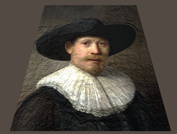 そこで、”The Next Rembrandt”サイトの説明用として使われている出力画像データから、レンブラントの新作を3D世界で眺めてみた例が上の画像です。こうして眺めてみると、レンブラントの新作というよりは、レンブラント風のレイアウトの画像に適当にテクスチャ(3次元形状)を付加したものにしか見えません。