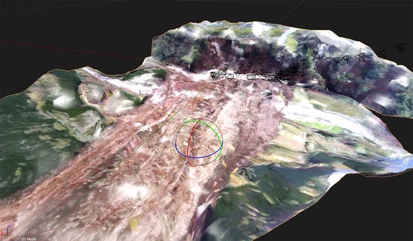 また、自分で3次元形状を生成してやれば、さらに下に貼り付けたような(国土地理院が提供している3Dマップより)高解像度な形状を得ることもできる。そのようにして得られた3次元の世界を、たとえばヘッドマウントディスプレイ(HMD)で立体視したりすれば、土砂の流れもわかりやすく感じられる。