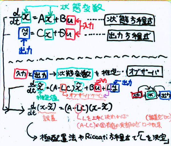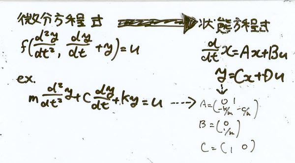本屋で理工系の棚を眺めてみると、制御工学の書籍がたくさん出版されている。その半分くらいは「Matlabによる○×制御工学」というような感じだ。手にとってみると、数式が滝のように流れていて、難しくて話の流れを終えない。最後は結局Matlabコマンド一発で済ませるなら、数式追いかけたくないような…流し読みしたいような…と考えて、ふとわれに返りカナシイ気分になりながら、「(いかにも)微分方程式」から「カルマンフィルタ」までのラクガキを下敷きに描く。