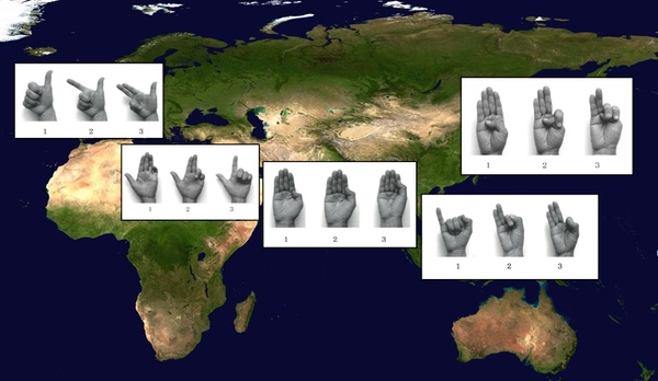 世界各地域で、「指を使った数え方」がどのように異なるかという"Counting with the Fingers"が面白かったので、この文献に出てくる「1〜3までの指を使った数え方」を世界地図上に並べてみたのが、下の図です。古代ローマでの数え方や今現在の日本の数え方…自分の指を使って考えたりする時の仕草にも、「いつの間にか身についた違い」があるんだな、と面白く感じます。
