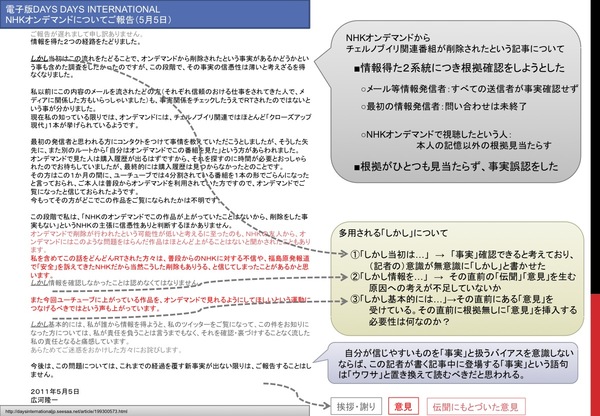 Fast&First掲示板で「NHKオンデマンドの番組に関する”ウワサ”」を眺めてからしばらくして、そのウワサを「事実」として記事にした電子版DAYS DAYS INTERNATIONALに「NHKオンデマンドについてご報告(5月5日)」というエントリーが書かれていました。