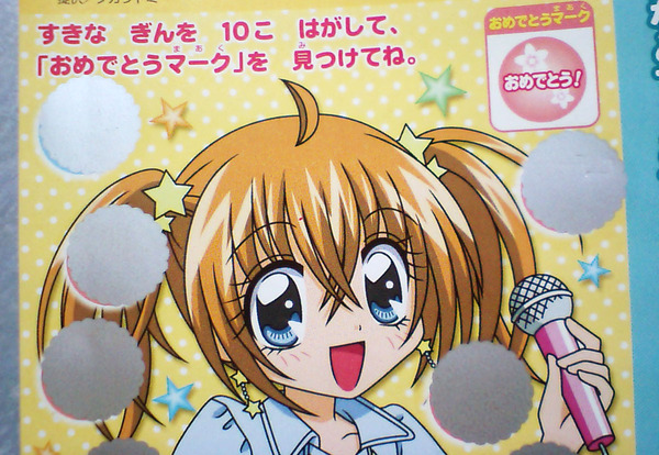 こういった「銀スクラッチ」は、後ろから強い光を中てると「(銀スクラッチの下に隠されている)こたえ」が浮かび上がって見えるものが多い。この小学一年生 四月号のプレゼントクイズの場合も、やはり後ろから光をあてると、答えが透けて見えてくる。右の画像は、きらりん☆レボリューション のイラストを白色LEDで背後から照らすことで、「あたり」と「はずれ」を透かし見た場合である。朱色インクで印刷された「あたり」と藍色インクで印刷された「はずれ」という文字が、やはり浮かび上がって見えることがわかる。