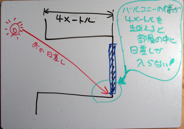 「バルコニー特許」の幾何学を使うと、バルコニーをマンションの壁から4メートルほど突き出すことができる。ところで、この"4メートル"を「幅広バルコニー(ベランダ)」と「冬の部屋」のヒミツで書いたことと同じように、「冬の寒く湿気た部屋を照らす暖かな日差し」という観点から考えてみると、面白いことに気づく。