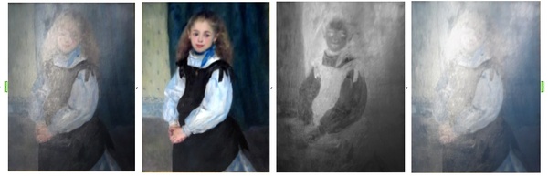 下に並べた画像は、ルノワールの「ルグラン嬢の肖像("Portrait of Mademoiselle Legrand")」を、撮影画像例(偏光フィルタが回転してる際に撮影された20枚程度の画像群の1枚です)・内部拡散色画像例・表面反射画像例色・合成画像例(自動回転偏光フィルタ付きカメラ手持ち撮影による)です。