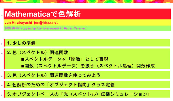 Mathematicaで作った色処理関連の関数群・それらを使いさらにオブジェクト指向に書いた(モンテカルロ光伝播シミュレーション機能付き)クラス群のライブラリに例題や説明文を付けたものを作りました。そのライブラリを記述したノートブックを、ColorLib_amature_on_7.0_1.01.nb (5.6MB) として、サイト上に置いておきます。