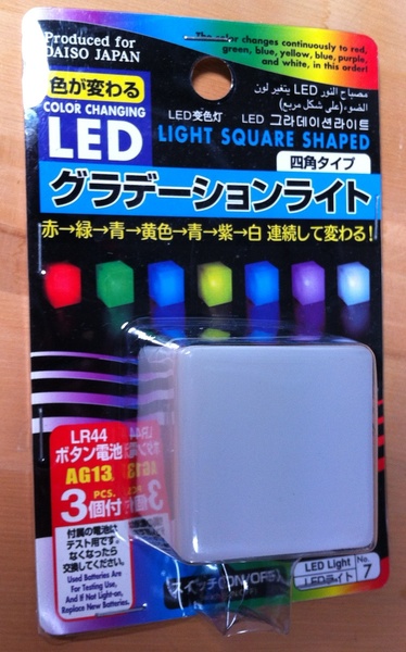 その快適さを、太陽が出ている時間だけでなく、星と月しか見えない夜にも味わいたくて、ビニールプール用「照明キット」を買って・作ってみました。部材を買いに行ったのは、もちろん100円ショップのダイソーで、総予算は百円玉ふたつでトータル200円ナリの照明キットです。