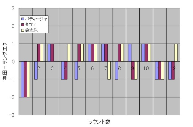 「亀田2—1で判定勝ち、王座獲得…WBA世界ライトフライ級王座決定戦」に掲載されていた採点表を元にグラフを作って、亀田興毅 v.s. ファン・ランダエタ戦を眺めてみました。まず、右側が「ラウンド毎の各審判の採点を棒グラフにしてみたもの」です。数値は「亀田ポイント - ランダエタ・ポイント」なので、0を境に上が亀田優勢で、0より下がランダエタ優勢です。特に何の傾向もないように見えます。