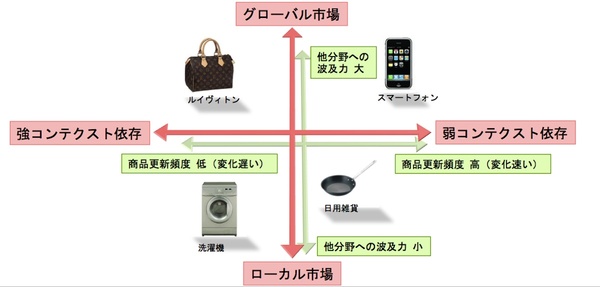 たとえば、「ルイ・ビトン」の商品というものは、その製品(企業)文化・歴史とともに価値が認められ(そういった歴史・文化と言った”コンテクスト”に強く依存しており)、そのコンテクスト理解が世界的に広まり売れています(グローバルである)。