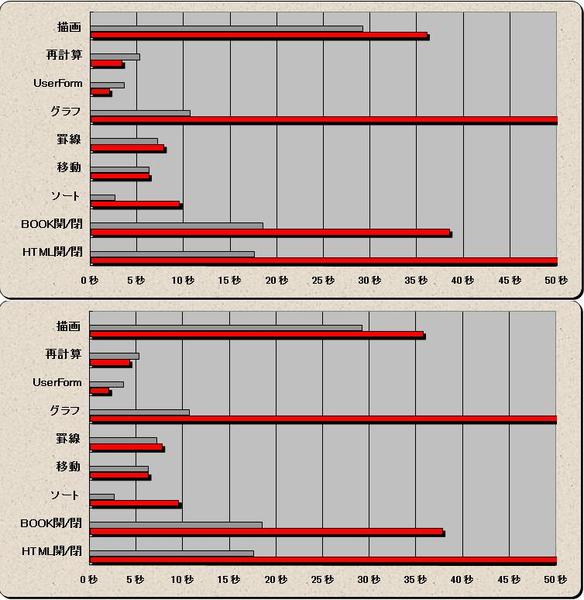それでは試しに、というわけで「ベンチマーク for Excel 2000」で、マルチスレッド機能(CPU数=1 or 2)の違いを見てみました。その結果が下の2つのグラフ(の赤表示部分)です。上がマルチスレッド有効にした場合で、下がシングルスレッドの場合になります。スレッド数での違いは、やはりほとんど見られません。