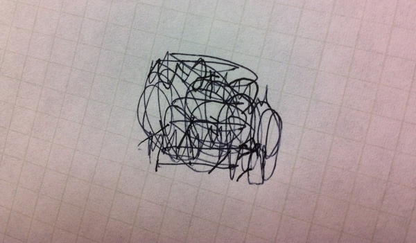 たとえば、そんな風に秘密メッセージを描いてみたところを赤外波長で撮影したのが動画です。最初にパイロット ハイテックCコレト の黒色(赤外光を吸収します)で秘密メッセージを描き、その後にゼブラ クリップオンマルチ の黒色(赤外光を吸収しません)でラクガキをしてみたところです。ちなみに、可視光で眺めると右上写真のようになり、全く読むことができません。