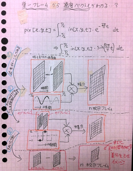 技術報告パネルに書かれた数式を眺め、動作をイメージしてみて、その疑問を解決する「答」がわかりました。ここで言う「単一フレーム」は、「ある瞬間の画像」を意味する「(いわゆる)フレーム」ではなかったのです。私が首をかしげた技術、「時間相関イメージセンサ(複素正弦波変調撮像)によるオプティカルフロー検出」を(私と同じように)疑問に感じた人もいらっしゃるかもしれませんので、この「単一フレームのヒミツ・トリック」に関するメモを、下に書いておきます。
