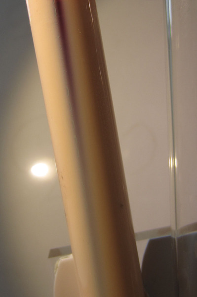 すると、肌色光拡散体の中に入れた赤ボールペン芯は、試験管表面近くにあると赤く見え、表面から離れて・内部にいくほど薄蒼色に見えてきます。静脈の深さ次第で(近傍周囲の反射スペクトルと比較して)蒼色光が多くなり・蒼色に見えたりすることや、血マメができた箇所が深くなると(皮膚表面からの距離が長くなると)青い血マメに見えてくるんだろうなぁ…と実感できたりします。