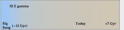 あの研究報告の「宇宙の色」と今回の「女性の色っぽさ」ではそれを求める方法もよく似ているが、驚くべきことに何とその結果もうり二つなのである。ちなみに、下が彼らが報告したIIIE gammaを用いて変換した場合の「宇宙の色」の変化チャートである。ビッグバンから今日、そして遙か未来までの宇宙の色の変化を示したものだ。