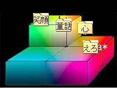 最後に、上の結果を大雑把ではあるがL*a*b*空間に配置してみたのが下の結果である。むちゃくちゃなやり方ではあるが、色空間の中で「エロ・童話・心・笑顔」といった抽象的なものの色が配置され、それぞれの色が何色であるかが判ると思う。「心」が「童話」と「エロ」の間に位置するなんて、何か意味深な気もするし、「エロ」と「笑顔」が結構離れているなんて、なんか笑っちゃう話のような気もするけれど、そういう想像は各人それぞれがする方が、きっと面白いに違いない。