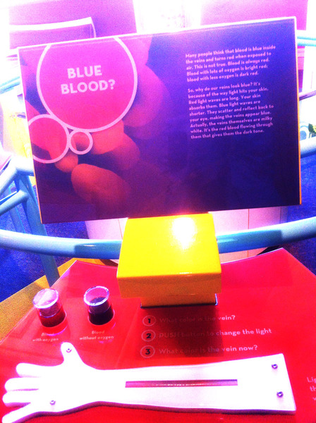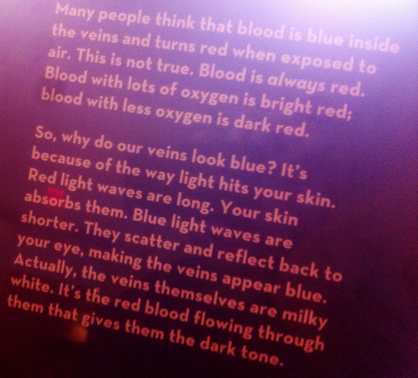 米国フィラデルフィアにあるフランクリン科学博物館で(こども向けの)科学展示物を眺めていると、「腕の静脈はなんで青く見えるの?」という展示がありました。そこには「ボタンひとつで静脈が青く見える理由を実感できる科学展示とともに、短いけれど、とても的確な解説が書かれています。