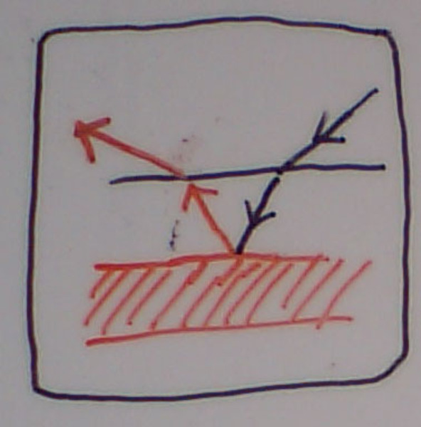しかし、白い服が水に濡れたときには、状況が異なってくる。水の屈折率が1.3強であるため、繊維と水の間の屈折率差が小さくなり、繊維と空気の間で反射・屈折があまり生じなくなってくる。その結果、照明光が白い服をそのまま通過して、服の下に到達・反射した後に、また白い服を透けて外に出てくる…ということになる。