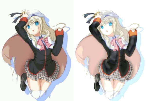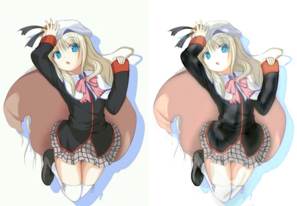 tweetで流れてきたアニメ絵を眺め、「アニメ絵の法線分布を擬似的に算出した上で、その法線分布を使ってハイライトや陰影を合成した”リアルな”アニメ絵」を作り出してみたら面白いかも…と思作業を始めました。そんな作業をしているうちに、ふと気がつくと、まるで「服脱がしゲーム」みたいな作業になっていました。…というわけで、ここら辺で「こ・これは、もう止めよう」と思った最後の瞬間が次の画像になります。