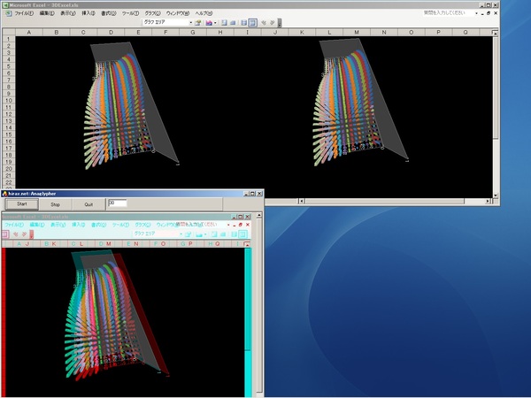 この上の動画では、画面上半分にエクセルの画面があり、左下に作成したソフトが表示している(赤青メガネ用の)立体画面があります。赤青メガネ用立体表示祖をしている画面の部分でマウス操作をすれば、立体グラフを自由自在に動かすことができる、というわけです。