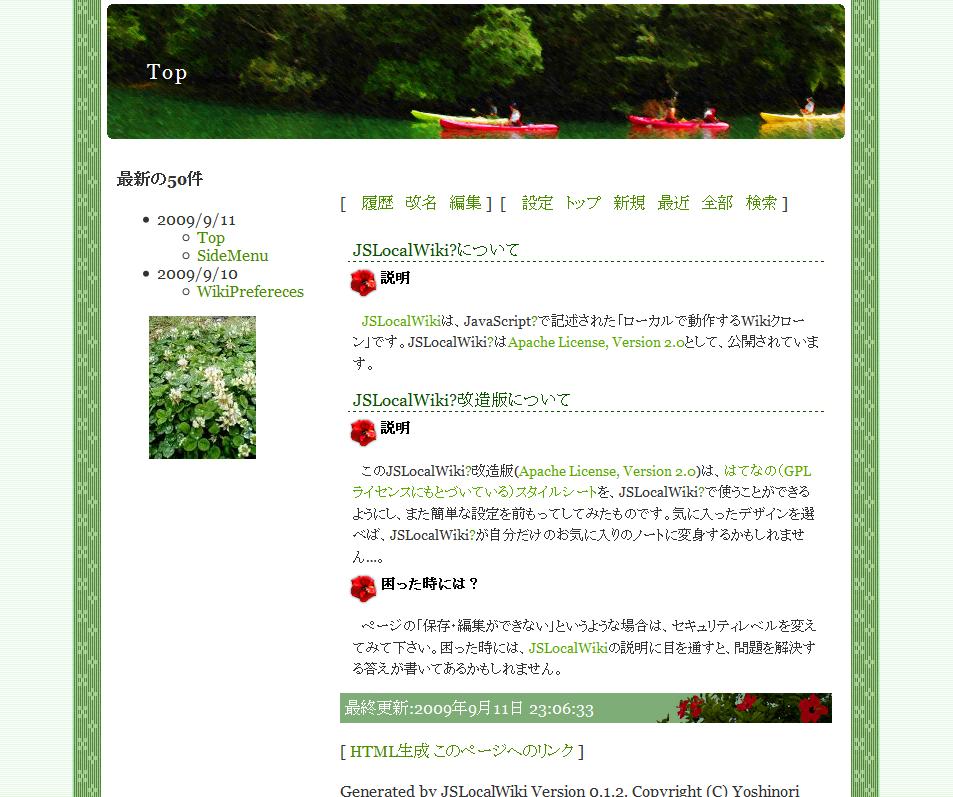 「JSLocalWikiを改造し、綺麗なお気に入りノートを作ってみよう」で書いた、「はてなの(GPLライセンスにもとづいている)スタイルシートを使うことができるようにし、同時に、簡単な設定を前もってしたJSLocalWiki」をダウンロードできるようにしましたここにおいてあるJSLocalWiki_0_1_2_h.lzh(3.2MB)です。ダウンロードしたらフォルダを解凍し、”JSLocalWiki.html”をブラウザで開くだけで(あるいは、JSLocalWiki.htaを動かすだけで)、綺麗なWikiシステムが動き出します。デザインを変えたければ、CSSスタイルシートを指定している部分を「気に入ったスタイルシート」に変えてやれば、簡単に好きなデザインに変えることができます。右上の画像は、hatena_ryukyu-green.cssを適用した場合の動作画面例です(配布状態でのデフォルト設定)。