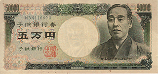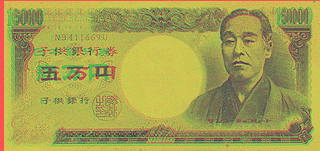 - (B) 子供銀行券、五万円、子供銀行、ケンコーチョコレート、印影、大蔵省印刷局製造