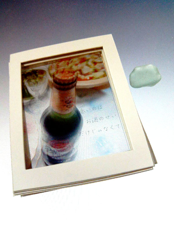 送られてきた封筒の中には、タバコ箱の大きさのものが二つ入っていて、その一つが今日のこの小さな芸術だった。三枚のスライド状のものを好きなように重ねて眺めるという"nikita po isuca"は、光に透かして眺める芸術品だ。第2シリーズということで、全6種類の内の一つらしい。なかなかキレイだ。