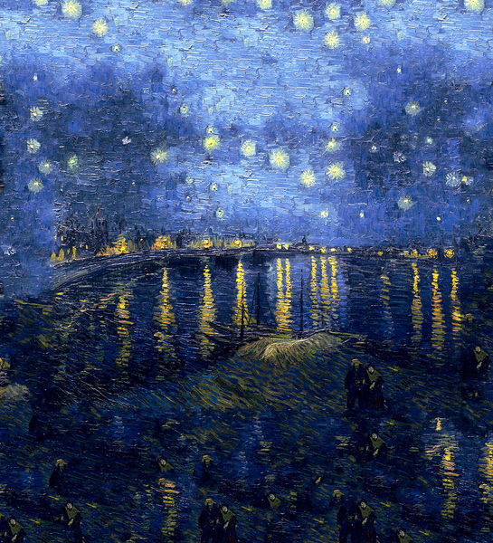 そして、Wolfram Blogをさらに眺めていると、ゴッホの画像から「キャンバス内に描かれなかったさらに外側を、描き出してみよう」という面白い記事があります。これは面白い!というわけで、同じくゴッホが描いた「ローヌ川の星月夜」を、額に収まらなかった世界の先をさらに広く描いてみました。