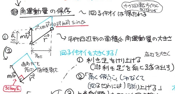 運動量のモーメント(角運動量)が、大雑把には、回転原点(ここでは単純のために鉄棒位置としておきましょう)と蹴り上げる足が持つ運動量の外積であること、つまり、その大きさが「鉄棒から足先」と「足の運動量」からなる平行四辺形の面積を考えると、それを最大化するために必要なことは「足を蹴り上げる方向は鉛直上方向ではなくて、平行四辺形が直角形となる「斜め上」であることがわかります。つまり、必要なことは「上に高く飛ぶ」ではなく「足を前上方に蹴り上げる」ことだということになります。