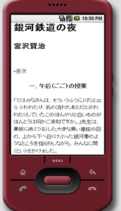 右の画面は、列車に乗り旅をする、宮沢賢治「銀河鉄道の夜」をケータイ風画面で眺めてみたものです。電車の中でケータイ画面を眺めるとしたら、もしも、宮沢賢治がそんな人たちを相手に文章を書き連ねていたとしたら、一体「銀河鉄道の夜」はどんな文体のどんな内容の物語になっていたのでしょうか。
