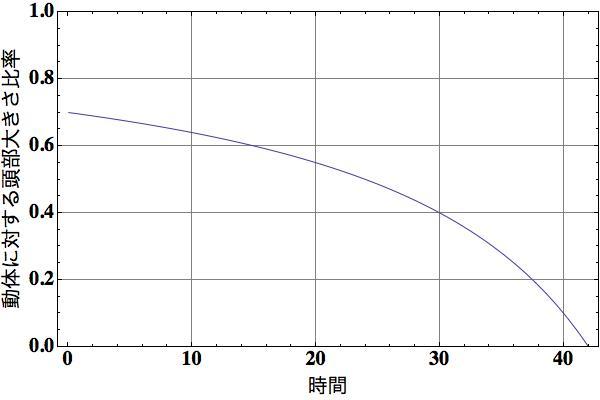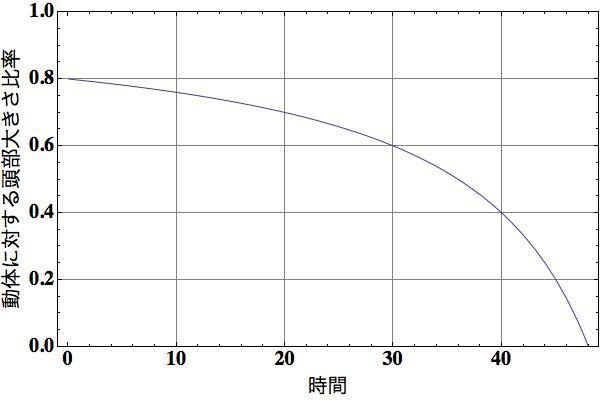雪降り後に街に残る雪だるまは、頭と胴体の大きさ比率を見れば、作られてからの時間経過を推定することができます。なぜかというと、雪だるまの丸く球形状の胴体や頭部が解けていくスピードはその表面積に比例するので(それを言い換えると、時間当たりの半径減少量は半径に寄らず一定だということになります)、時間が経過するにしたがって胴体に対して頭部が小さくなっていくからです(下図のグラフ参照)。