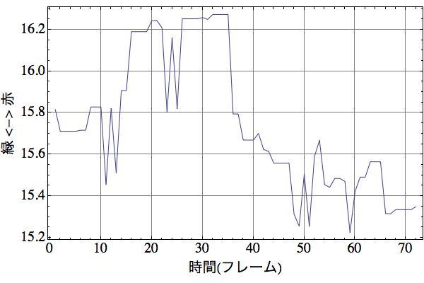 スマホカメラで写した顔画像で脈拍を検出することができるなら、テレビに写された顔の画像からも、もしかしたら(写っている人の)脈拍を検知することができるかもしれない?と思いつきました。そこで、前田敦子がTV画面に向かって話す映像をコンピュータで明るさ・緑/赤方向の色変化・黄青方向の色変化に分解し、顔に相当する部分だけの緑/赤方向の色変化だけを抜き出してグラフにしてみました。