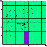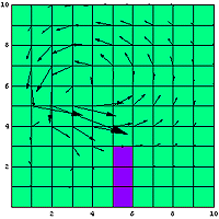 計算するモデルは次の図に示すような部屋である。四畳半一間であるかもしれないし、100畳以上の大きな広間かもしれないが、とにかく正方形の部屋だ。向かって左の青い丸部分にはエアコンがあり、そこから冷たい空気が送られてくるのである。そして、この部屋には何故かタンスがおいてある。「やっぱり、この部屋は四畳半一間じゃないの」というツッコミは言ってはいけない約束である。とりあえず、このタンスが向かって下側にある紫の部分である。このタンスが、エアコンから送られてくる冷た〜い空気流の障害物となるのである。