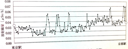 下のグラフは、彼らが修学旅行や一泊の京都旅行をする中で「はかるくん」を使い、東海道新幹線「東京駅から京都駅まで」の区間で測った放射線量です。